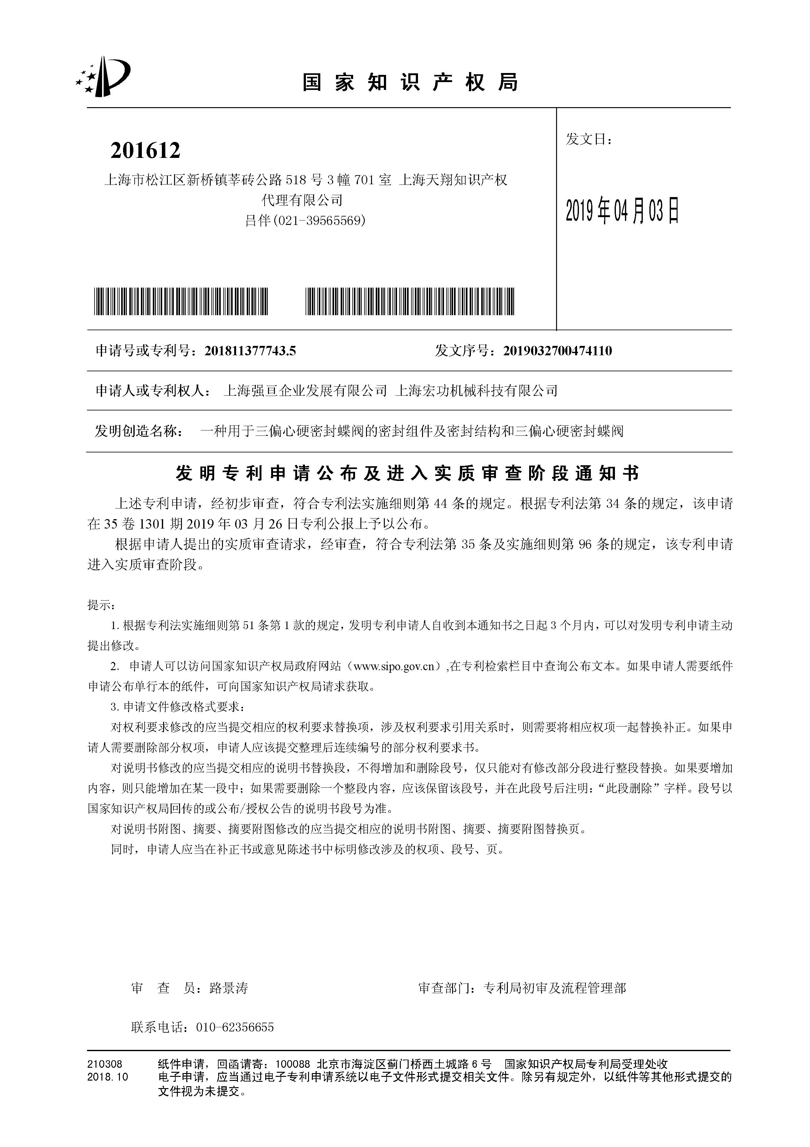 (發(fā)明專利通知書)一種用于三偏心硬密封蝶閥的密封組件及密封結(jié)構(gòu)和三偏心硬密封蝶閥